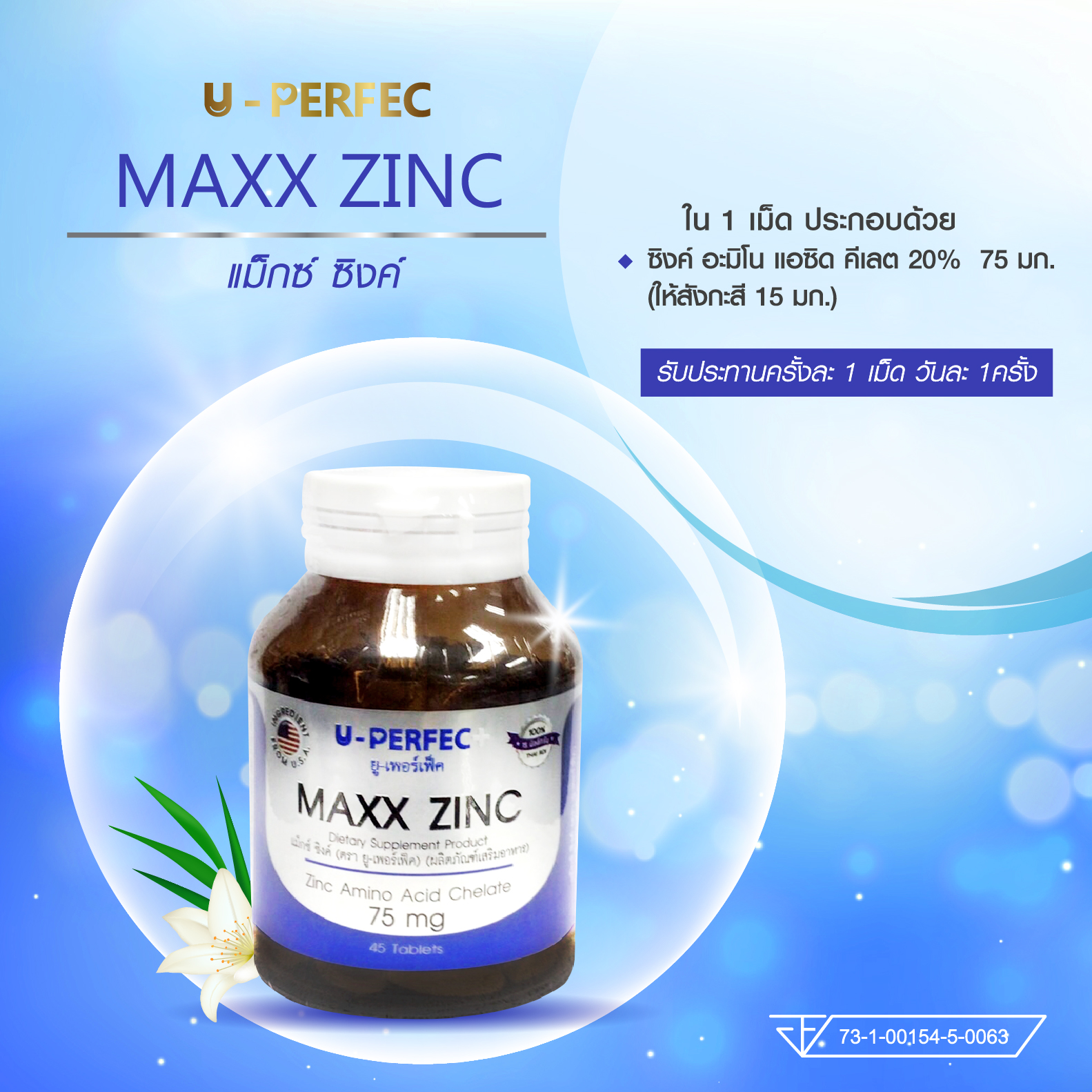 แม็กซ์ ซิงค์ 75 มก. ขนาด 45 เม็ด ใน 1 ประกอบด้วย -ซิงค์ อะมิโน แอซิด คีเลต 20% 75 มก. (ให้สังกะสี 15 มก.) รับประทานครั้งละ 1 เม็ด วันละ 1 ครั้ง ผลิตภัณฑ์เสริมอาหาร เลขใบรับจดแจ้ง 73-1-00154-5-0063
